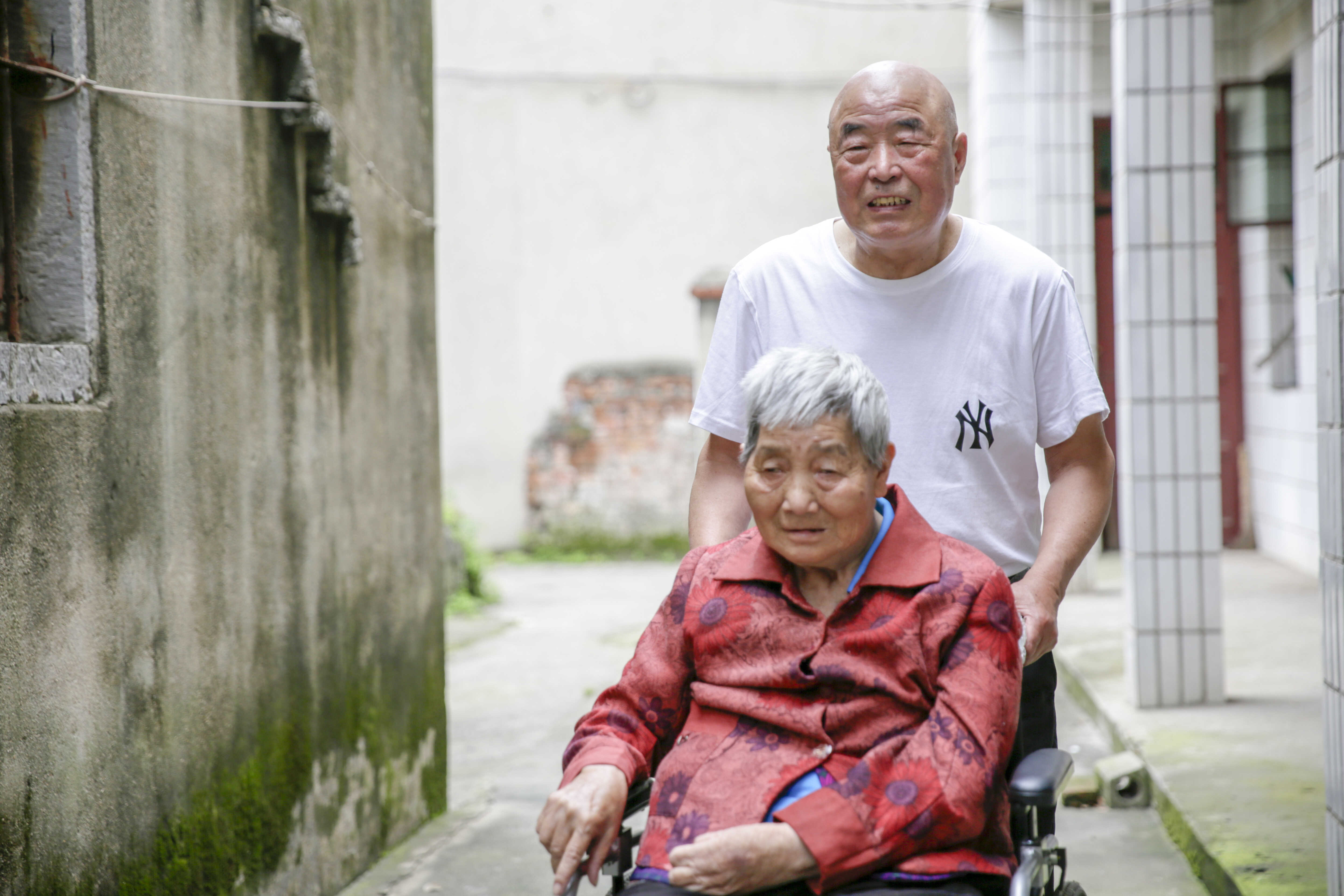 2010年3月的一天,黃相英坐在門口跟別人聊天,準備起身回家做午飯時,突然倒在地上。送到醫院診斷,結果是血管破裂引起的腦溢血,出院后,黃相英半身癱瘓,只有一邊手腳能動,但沒有力氣,一吃飯就撒一身。于是,每次吃飯,汪賢商就像喂小孩一樣喂飯。老伴喜歡吃稀飯、面條等好消化的食物,他就變著花樣給她做。在他的精心照顧下,黃相英的身體一天天恢復了,精神狀態也不錯。汪賢商深知妻子喜歡出門活動,唯恐她在家憋悶不開心,只要不下大雨或下雪,汪賢商堅持推著輪椅帶老伴黃相英出門,擔心老伴長期不鍛煉,手腳會萎縮,汪賢商想了個“土辦法”,每天都用繩子套在老伴的腳上,一只手抱著她前行,另一只手拉動繩子幫她移動鍛煉。汪賢商說,這些年下來,繩子和皮帶都用斷了十幾根,輪椅也用壞了十幾輛。