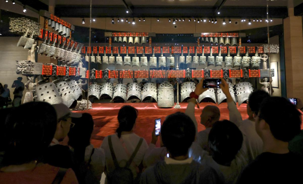 5月18日,觀眾在湖北省博物館內參觀編鐘文物。5月18日是國際博物館日。人們走進博物館,叩啟時空之門,“觸摸”文化的年輪。新華社發