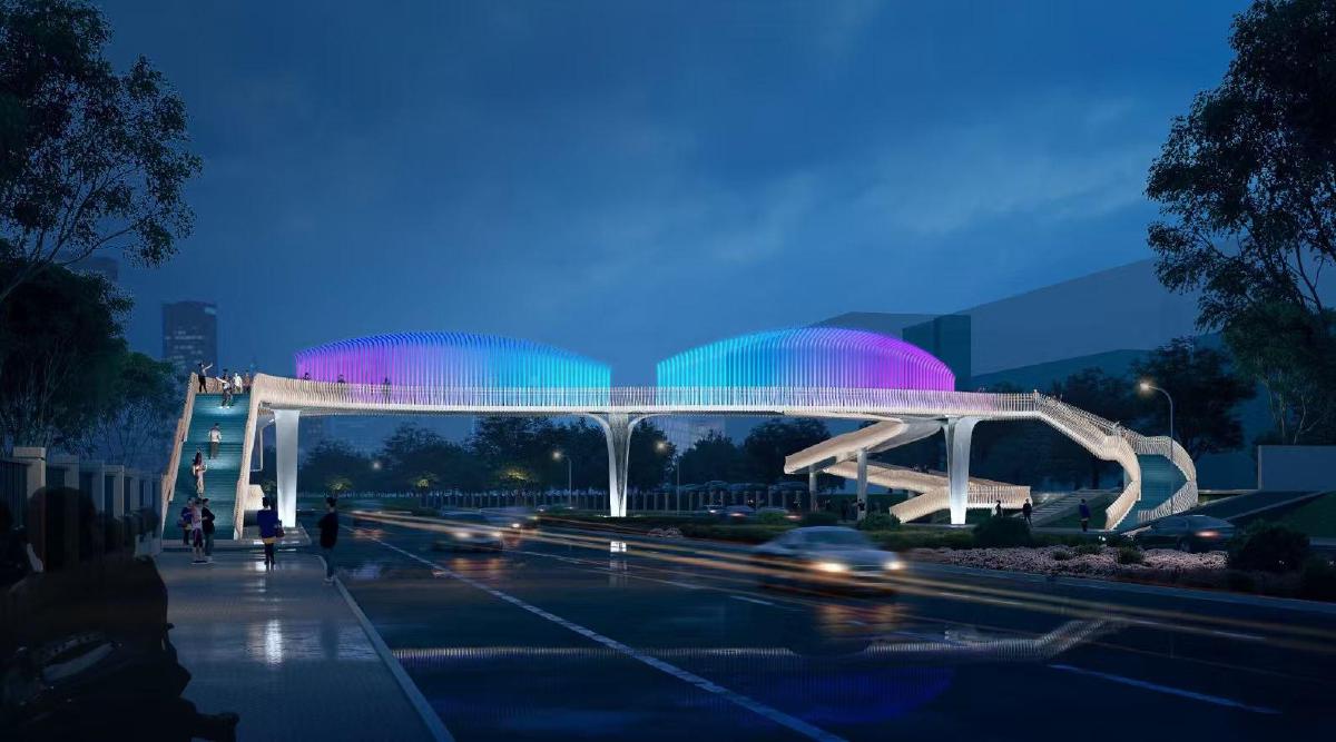 據了解,該人行天橋平面布置主要結合現場環境條件,因地制宜,主橋呈S型,理工校醫院側梯道呈C型,坡道采用設置轉向平臺的方式,在滿足天橋通行需求前提下,減少對既有人行道的占用;人行欄桿以“外掛”的方式附著于橋梁兩側,立面采用獨特造型,橋面中心設置變高圓管格柵加以點綴;踏步照明區域以功能照明為主,橋面通過單色靜態光,自下而上投光形式,整體以自然內透為主,避免過度照明;橋墩設計參照毛筆筆架,表面真石漆涂裝,外側鋁板包裹,獨特的外觀設計立意新穎,該橋建成后又將成為我市一處網紅打卡點。