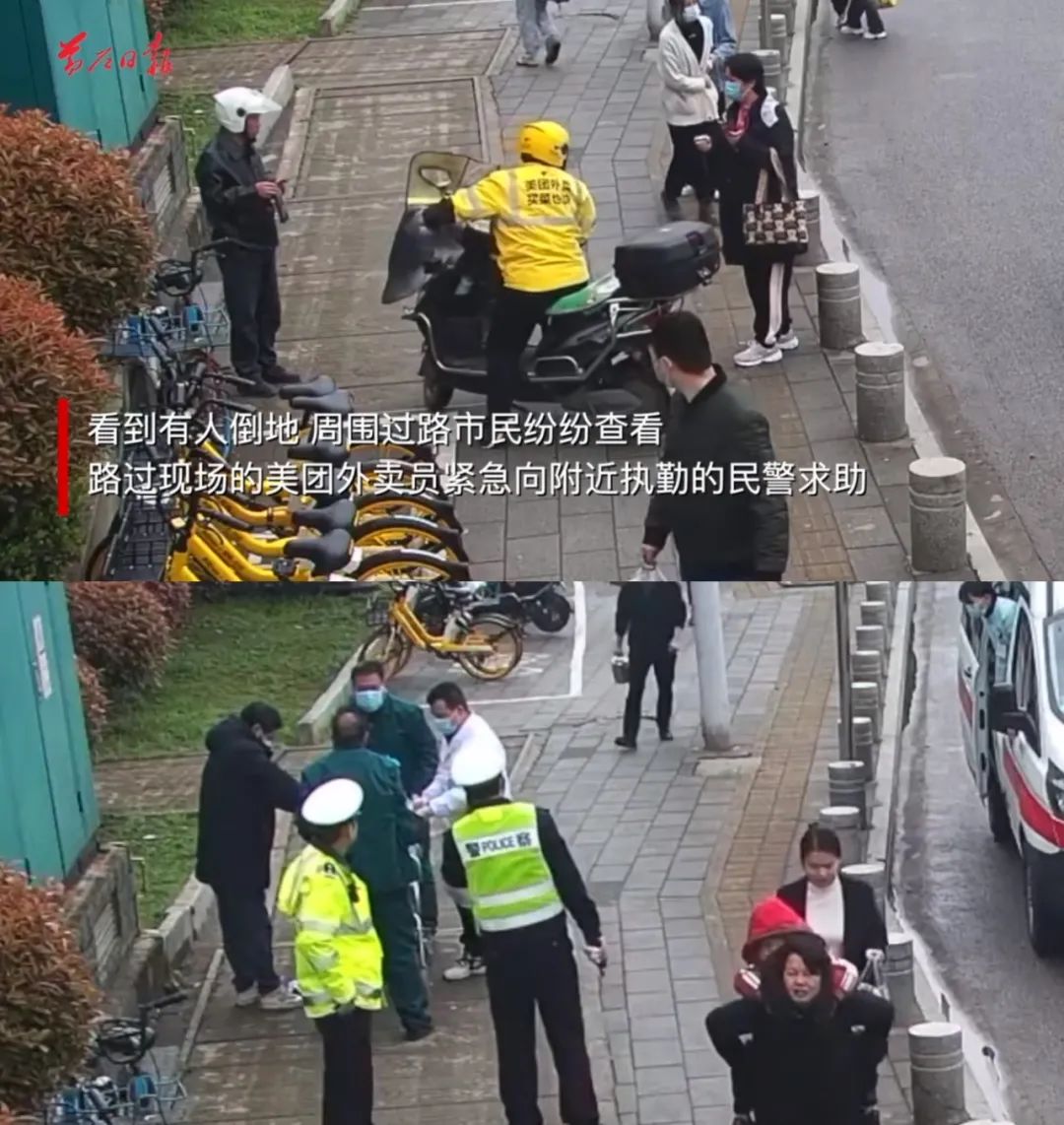 路過的美團外賣女騎手也看到了倒地男子,一名路過的男青年幫倒地男子取掉口罩以方便其呼吸,一名頭戴鴨舌帽年紀較大的男子拾起手機幫其保管,兩人合力扶男子坐起,兩名交警接到求助感到現場,交警扶住倒地男子并聯系上男子家屬。很快,救護車趕來對男子進行檢查后將其送往醫院救治。外賣送餐員、過路市民、路口執勤交警、120醫護人員接力施救,男子轉危為安。