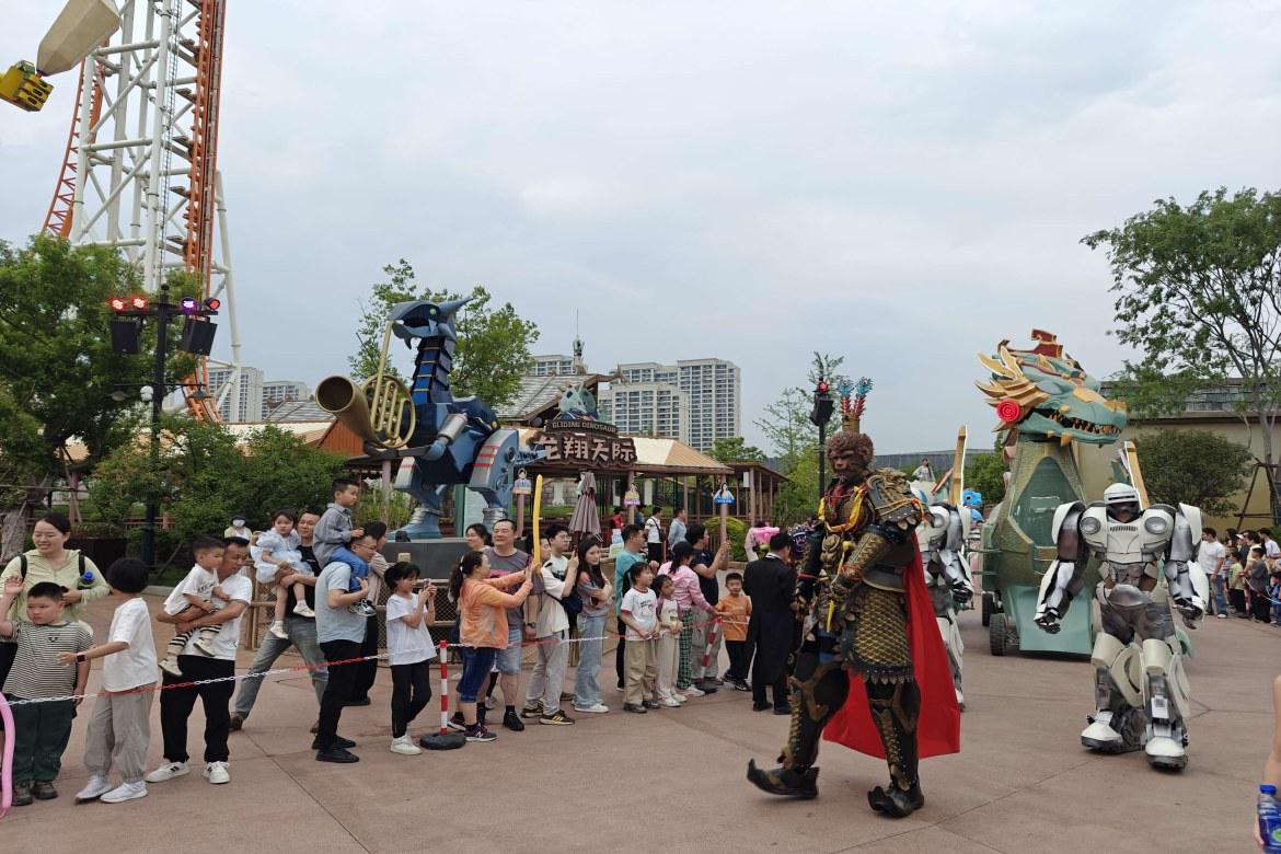 “哪吒之奇域鬧海”主題巡游演繹無疑是活動的重頭戲。從5月1日至5日,整個園區(qū)營業(yè)時間內(nèi),這場巡游貫穿始終。活動以當下爆火的國漫IP“哪吒”的神話故事為藍本,游客踏入度假區(qū),便能看到哪吒、敖丙、太乙真人等動漫角色穿梭其中,與游客熱情互動,仿佛置身于奇幻的神話世界。